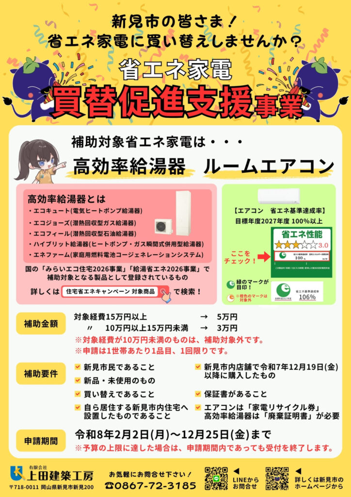 本日は「給湯器、そろそろ替え時かな…」「エアコンの電気代、気になるな…」 そんな方にぜひ知っていただきたい、新見市で始まった「省エネ家電 買替促進支援事業」をご紹介いたします♪